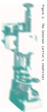 When you think about it, no one really sees the exterior of the Internet anyway. Sitting bleary-eyed in the dim glow of our screens, we feel like we're simply wandering, glimpsing the programmed innards of one computer before bouncing onto another. What would all these small parts put together look like if they were assembled (see figure 1)? We like that the Internet seems a shapeless, shifting perpetual work in progress.